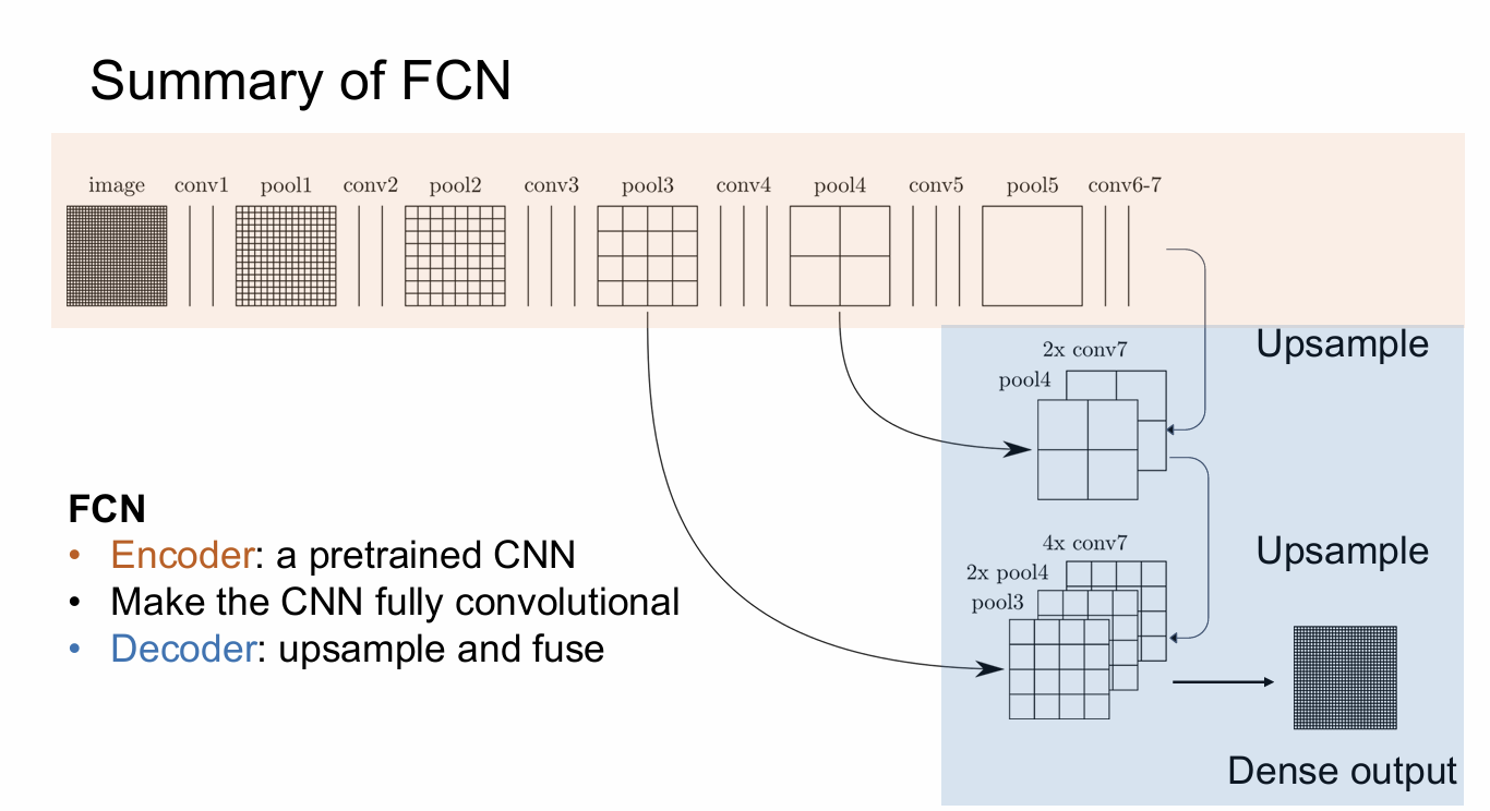 FCN 的核心思想是:预训练的编码器 + 上采样解码器 + 跳跃连接。